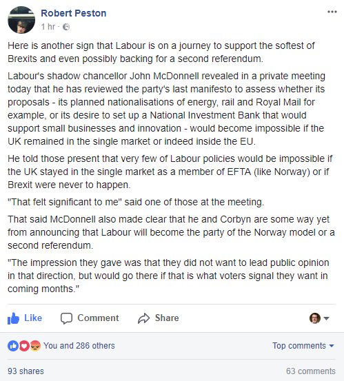 No, on the contrary, I've said numerous times that Corbyn is your best hope for a "soft" Brexit . It isn't going to happen under the Tories (unless you call CETA "soft"). It's ironic, because Corbyn is a hardcore Brexiteer, not a moderate, but he's got his eye on the bigger prize. If the Tories split, what follows would be highly unpredictable (ordinarily, it wouldn't be an election, because the Tories are ruthless with leadership transitions, but it would have to be an election with WTO). In those circumstances, Corbyn must be a realistic outcome. But, let's face it, Corbyn (or, rather, McDonnell), would make WTO look like a cakewalk.