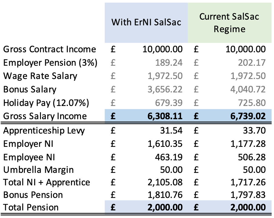 Clearly, the greater the level of SalSac to pension, the greater the impact of this on an umbrella worker. That said, there could be a different rate of NI applied from the current 13.8% ErNI. Who knows?
