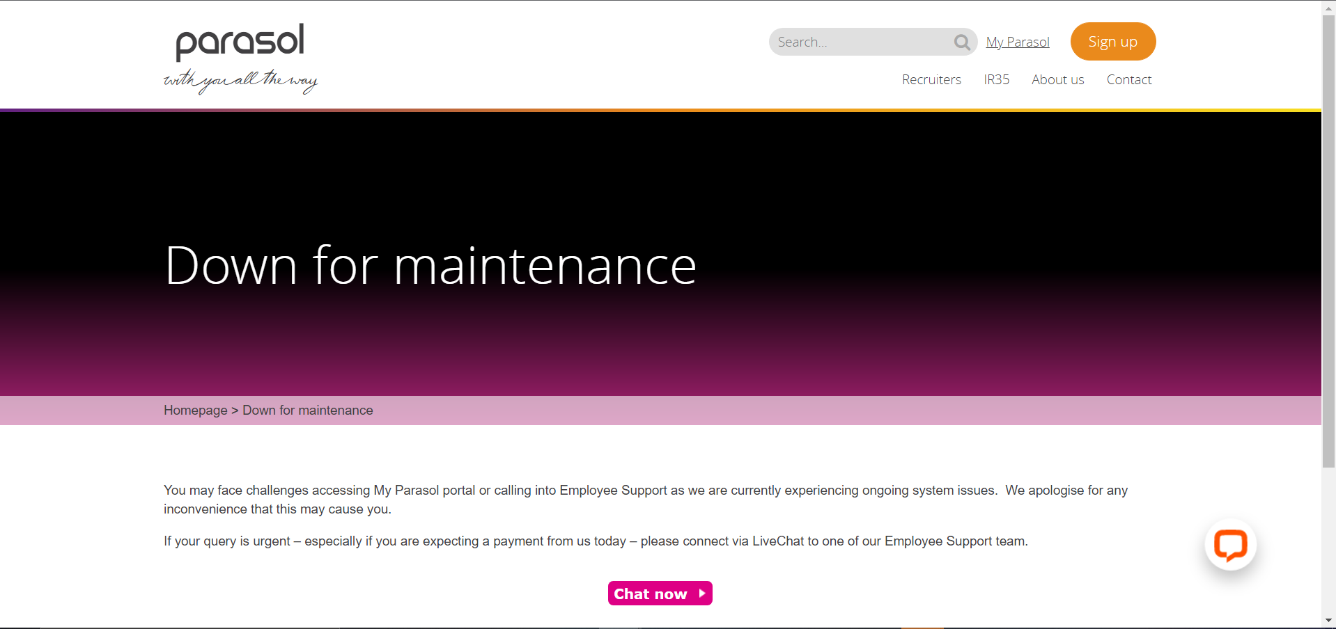 If you type the myparasol address in to the browser directly you get the strange certificate message - however if you load parasolgroup.co.uk and then click the myparasol link it says that they are undergoing maintenance and you cant get through on phone either so to contact them urgently you need to send a chat message from that page.